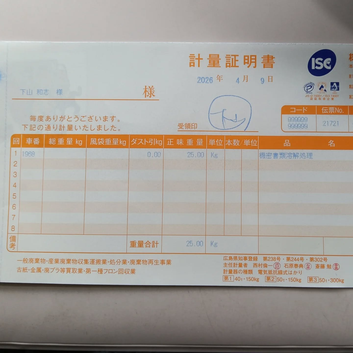 業務の特性上、なかなかペーパーレスにならないので、溜まった個人情報、機密情報を含む書類は溶解処理に出します!